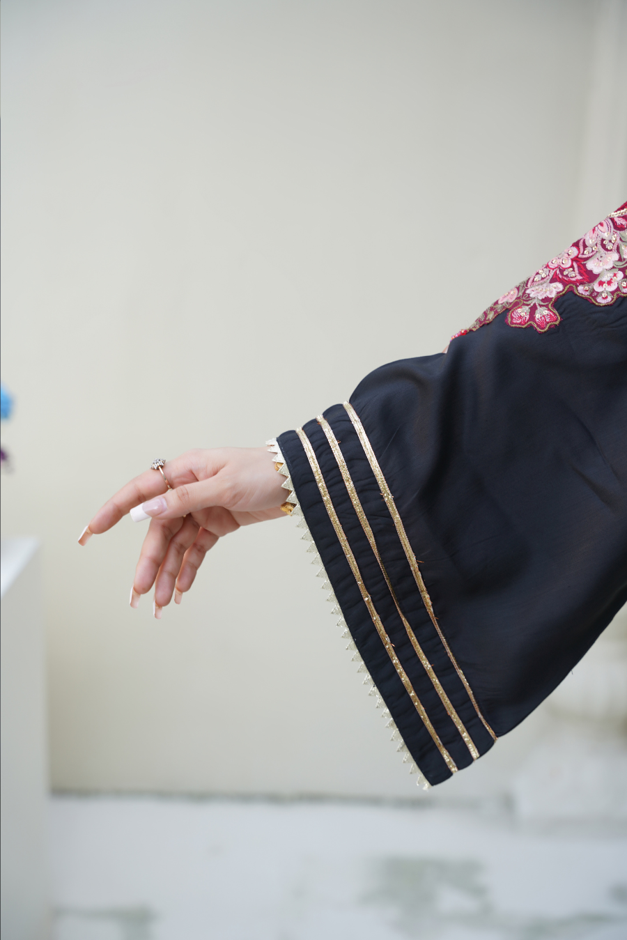 Elevate your wardrobe with the Noor B – Black Embroidered 2Pc Suit from our Rozana Collection. Crafted on a premium black viscose base, this outfit is adorned with striking maroon and gold embroidery that exudes timeless elegance. The flowing cut with wide sleeves ensures both comfort and sophistication, while the breathable viscose fabric makes it perfect for festive dinners, family gatherings, or evening occasions. The matching plain trouser completes the look, giving you a graceful and versatile silhouette.