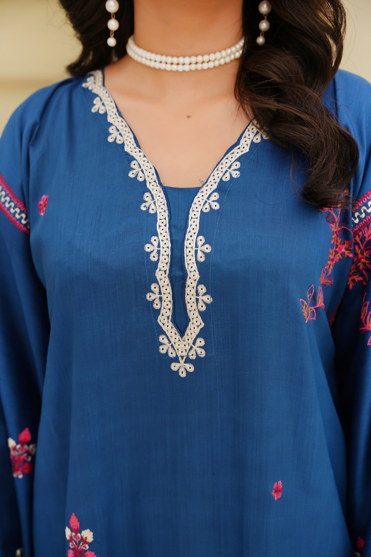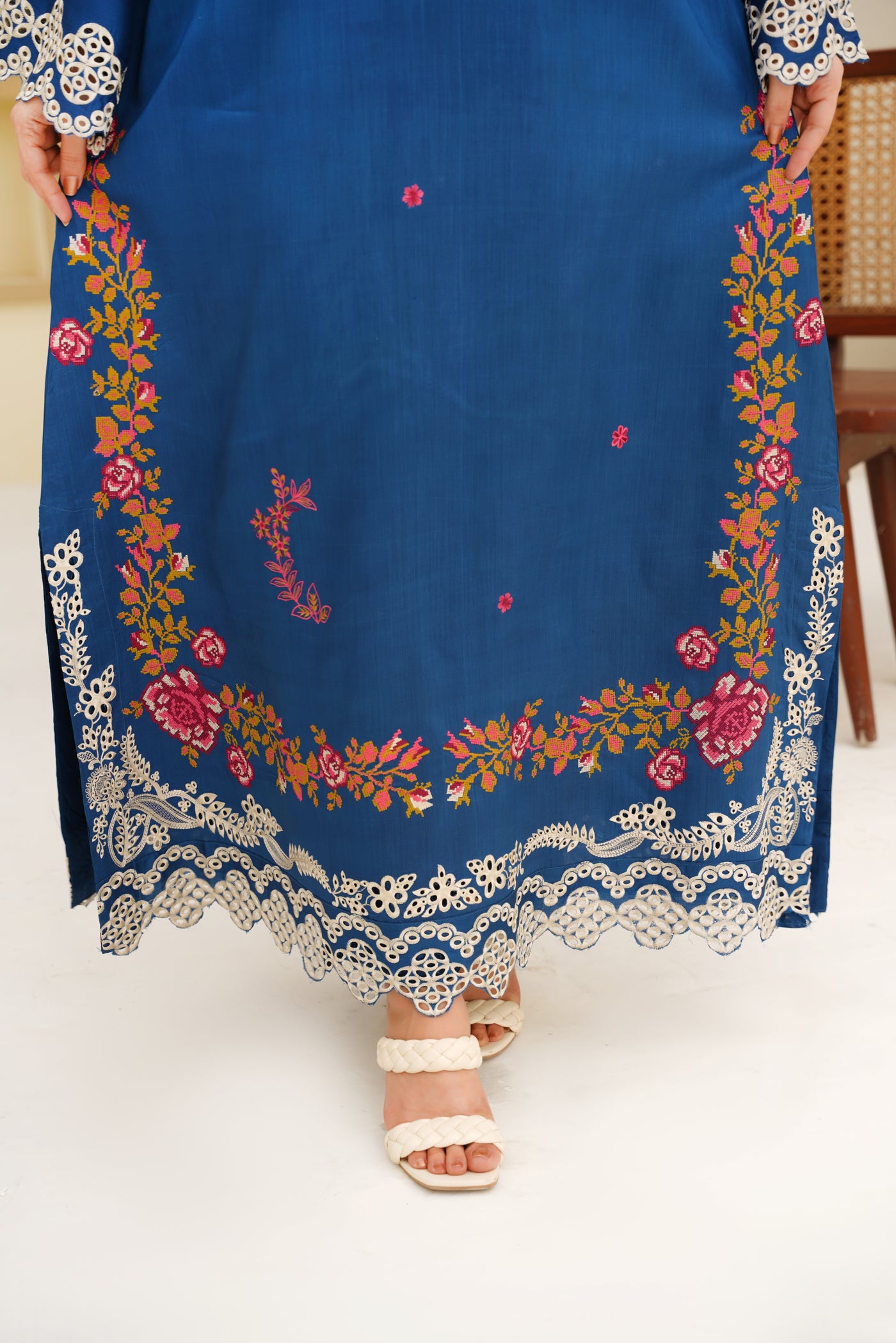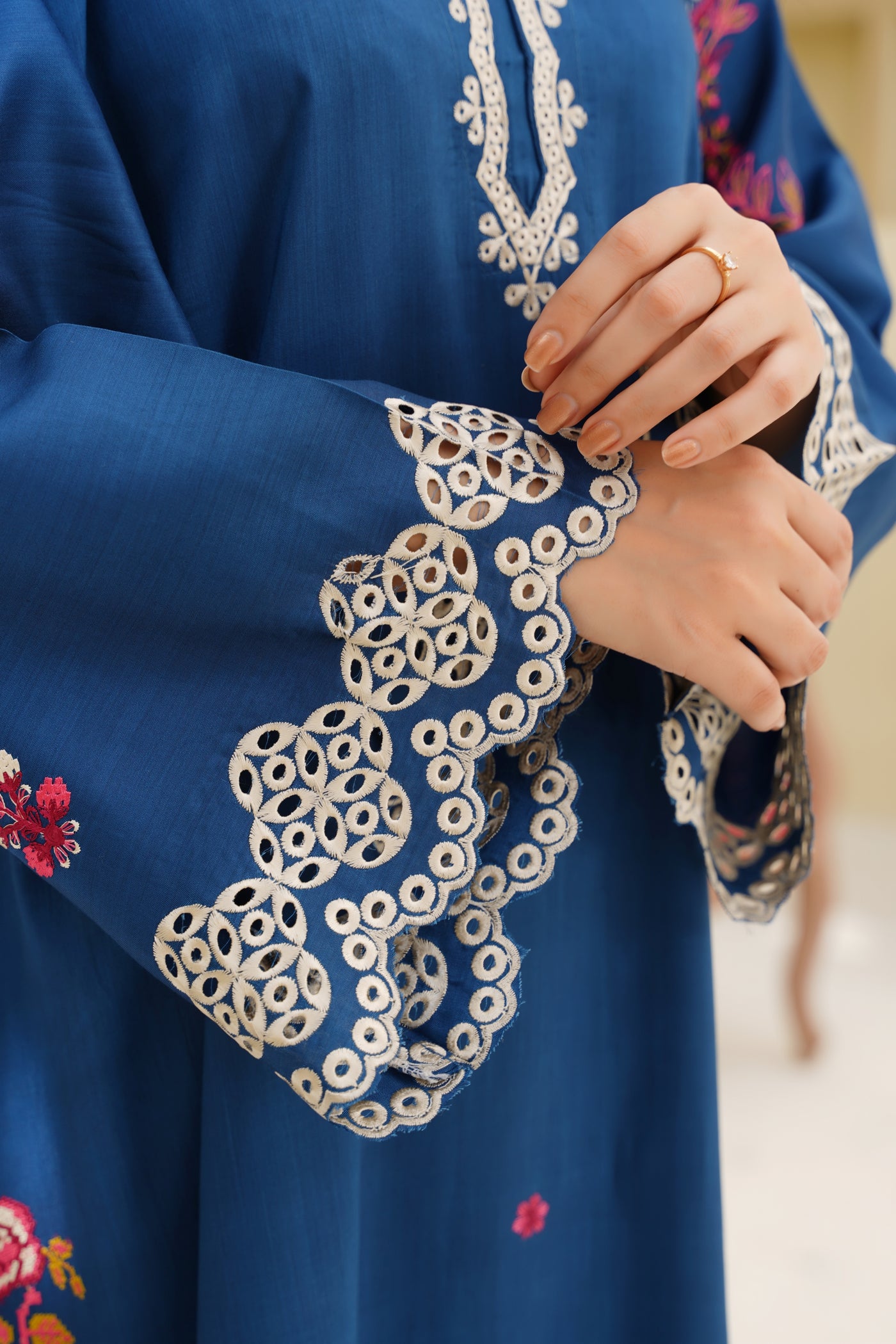 Azure Bloom captures the essence of timeless elegance with its vibrant blue hue and delicate embroidery. Crafted from breathable cambric cotton, this 2Pc Embroidered Suit features intricate white lacework and pink floral thread embroidery on the sleeves, hem, and side panels — creating a soft yet striking festive aesthetic. Paired with matching trousers, it’s a perfect choice for brunches, daytime occasions, or semi-formal evenings. Lightweight, graceful, and chic — Azure Bloom is a versatile addition to your wardrobe.