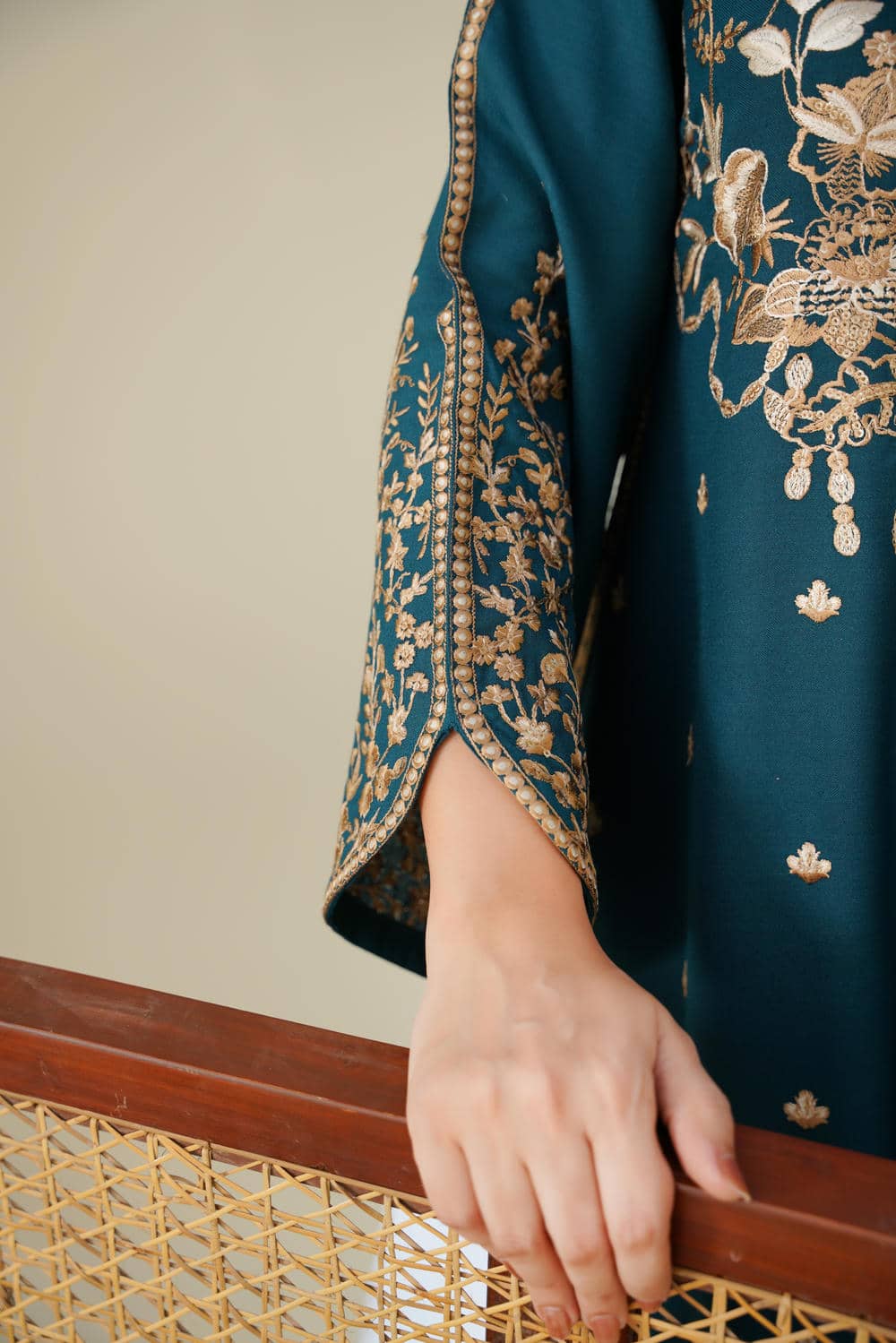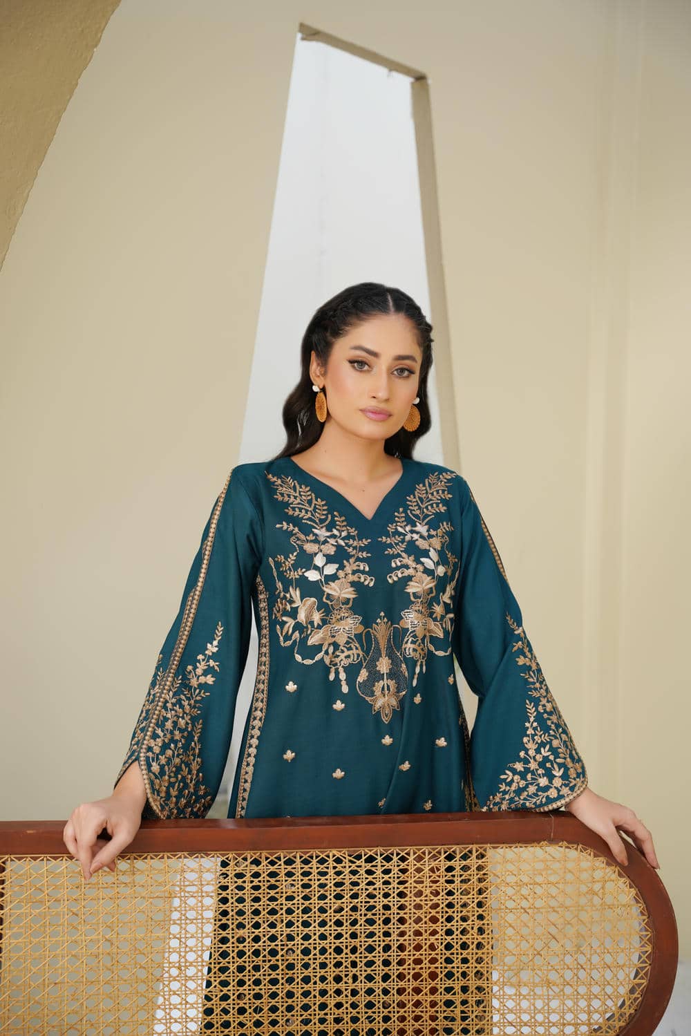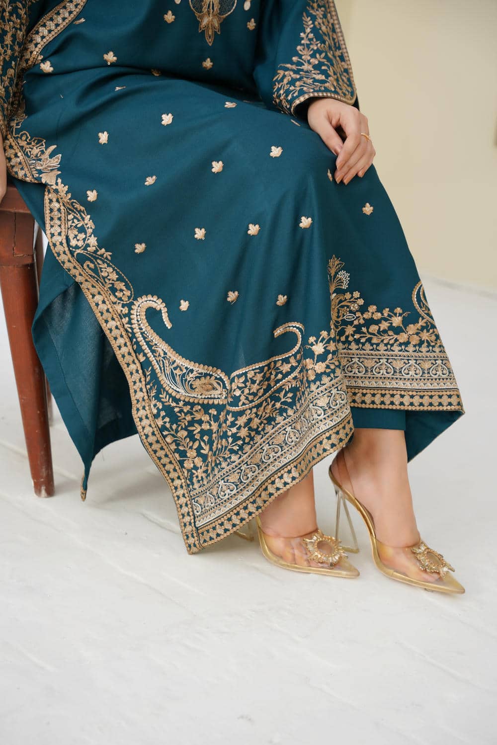Step into elegance with Maya Teal — a 2Pc Embroidered Suit that blends classic charm with modern style. Crafted from soft cambric cotton in a deep teal shade, this outfit features intricate golden thread embroidery on the bodice, sleeves, and hemline. Paired with straight trousers, Maya Teal is designed to deliver comfort and sophistication, making it an ideal pick for festive occasions, casual gatherings, and semi-formal events. Lightweight, breathable, and stylish — this is a timeless addition to your wardrobe.