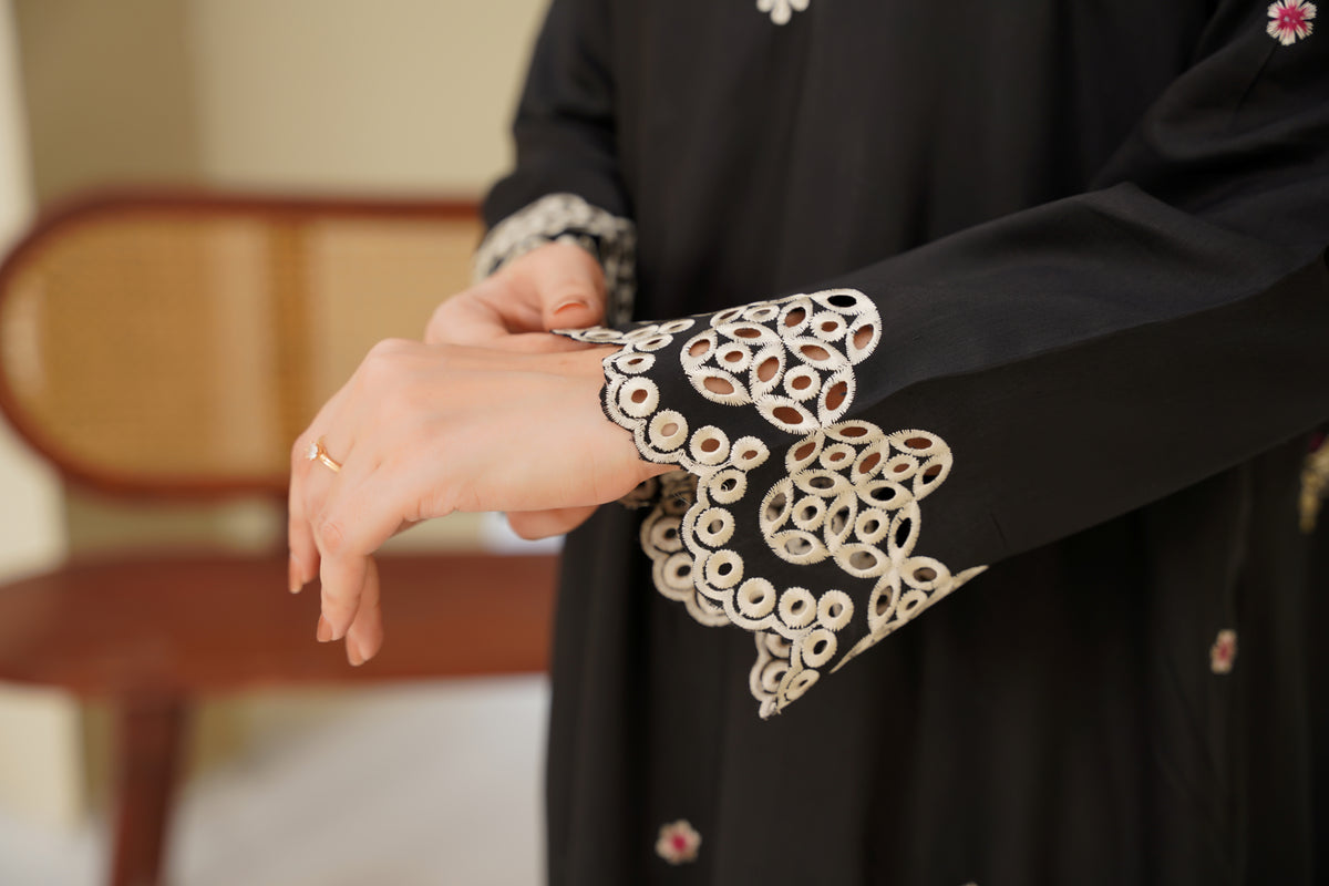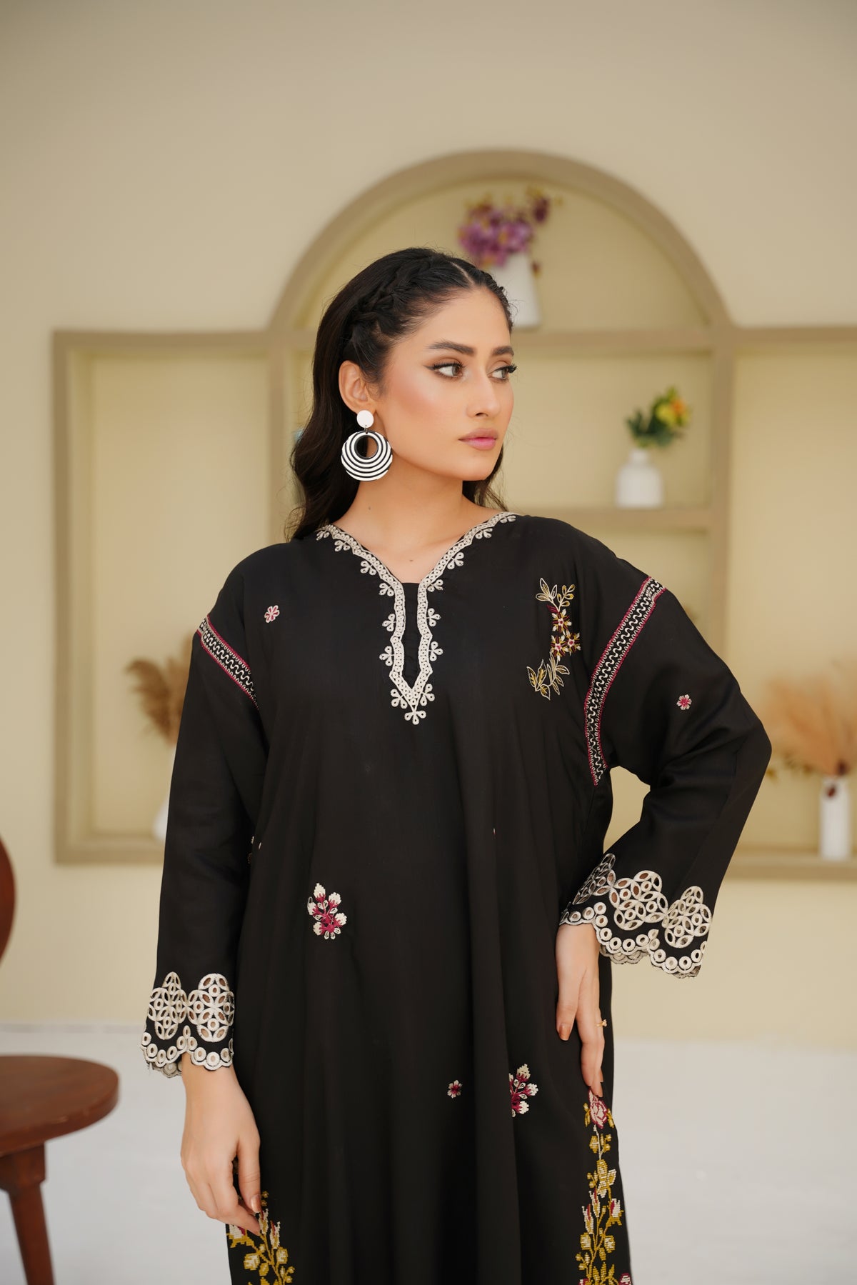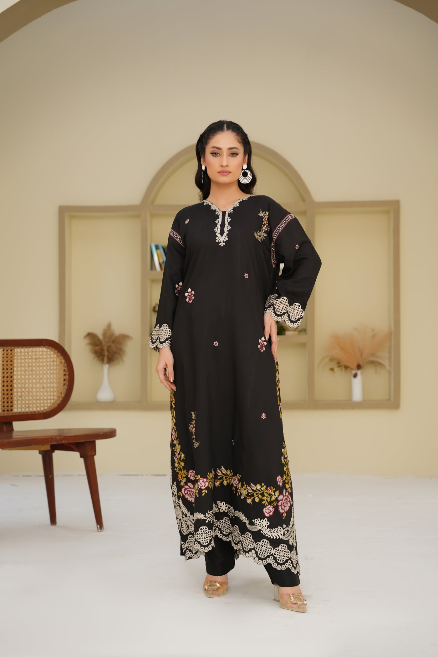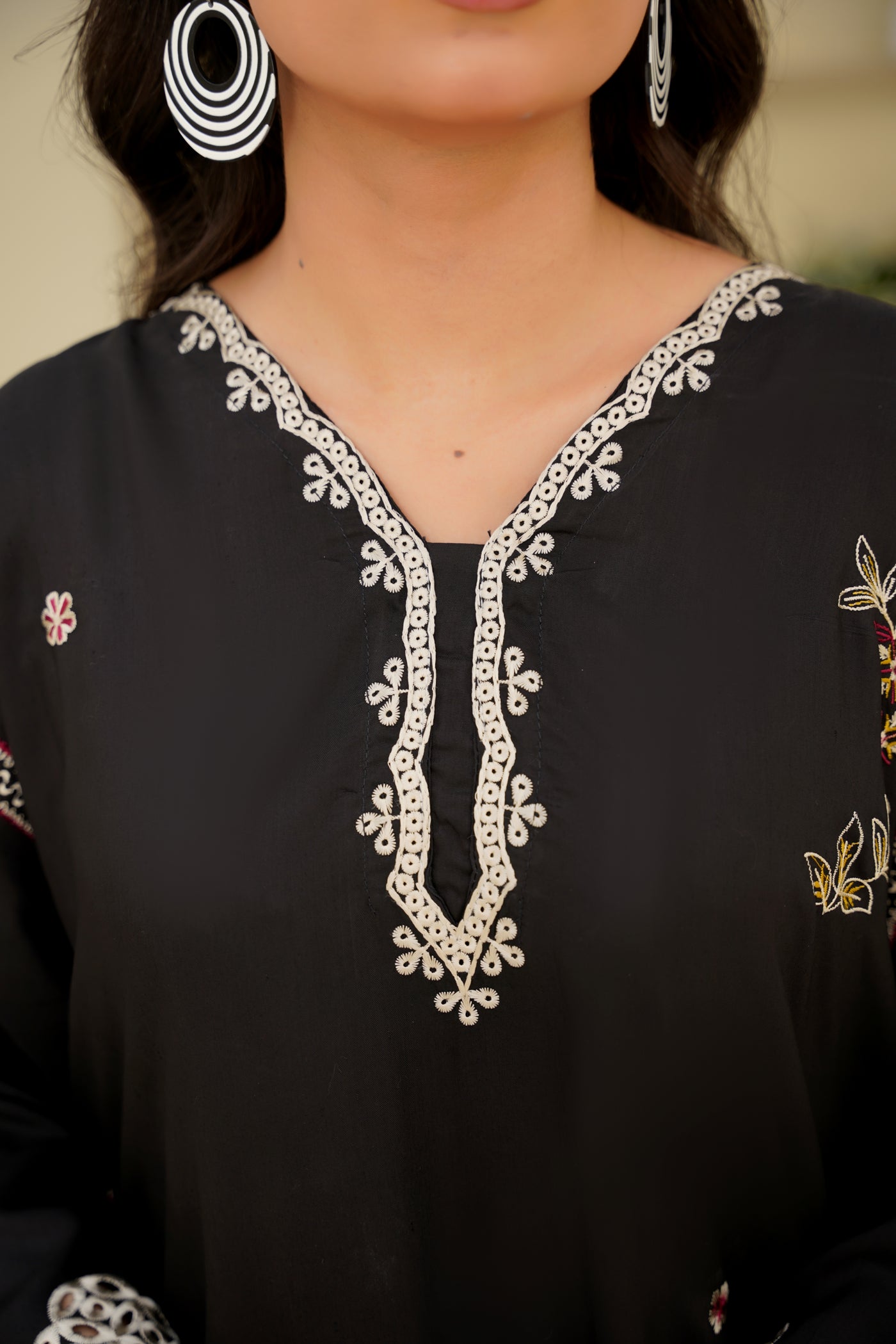 Midnight Bloom embodies timeless sophistication with its rich black base and intricate floral embroidery. Crafted from premium cambric cotton, this 2Pc Embroidered Suit features delicate white lace detailing along the sleeves and hem, enhanced with vibrant thread florals on the front panels — creating a graceful festive statement. Paired with matching trousers, it’s perfect for family gatherings, brunches, or semi-formal evenings. Lightweight and elegant, Midnight Bloom is a wardrobe classic.