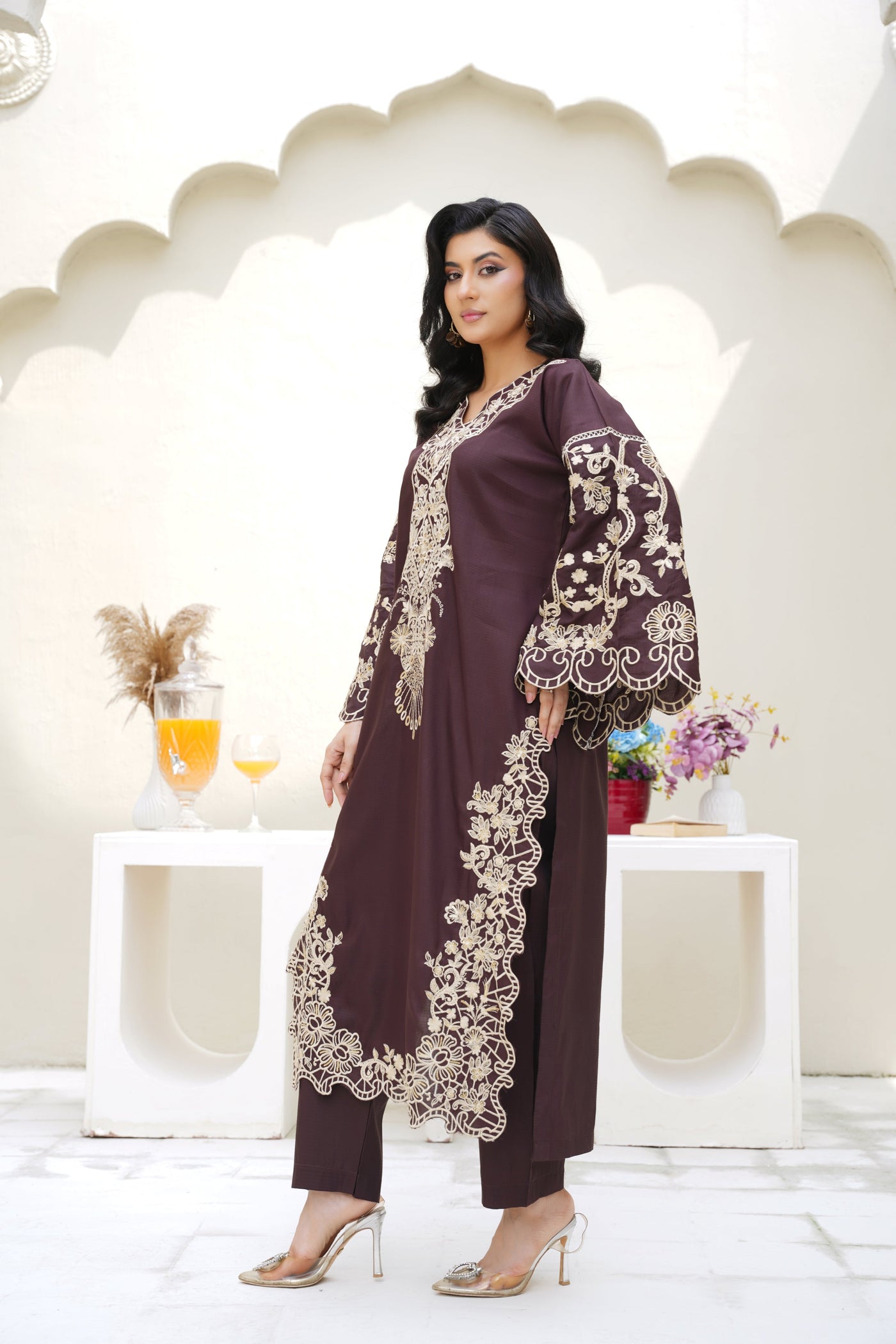 Elevate your festive wardrobe with the Noor – Chocolate Brown Embroidered 2Pc Suit from Rozana Collection. Crafted on a rich chocolate brown viscose base, this outfit features intricate embroidery that reflects pure sophistication. The breathable viscose fabric ensures comfort and luxury, making it an ideal pick for festive dinners, family gatherings, or evening occasions. The coordinated trouser completes the look, offering a versatile and graceful silhouette.