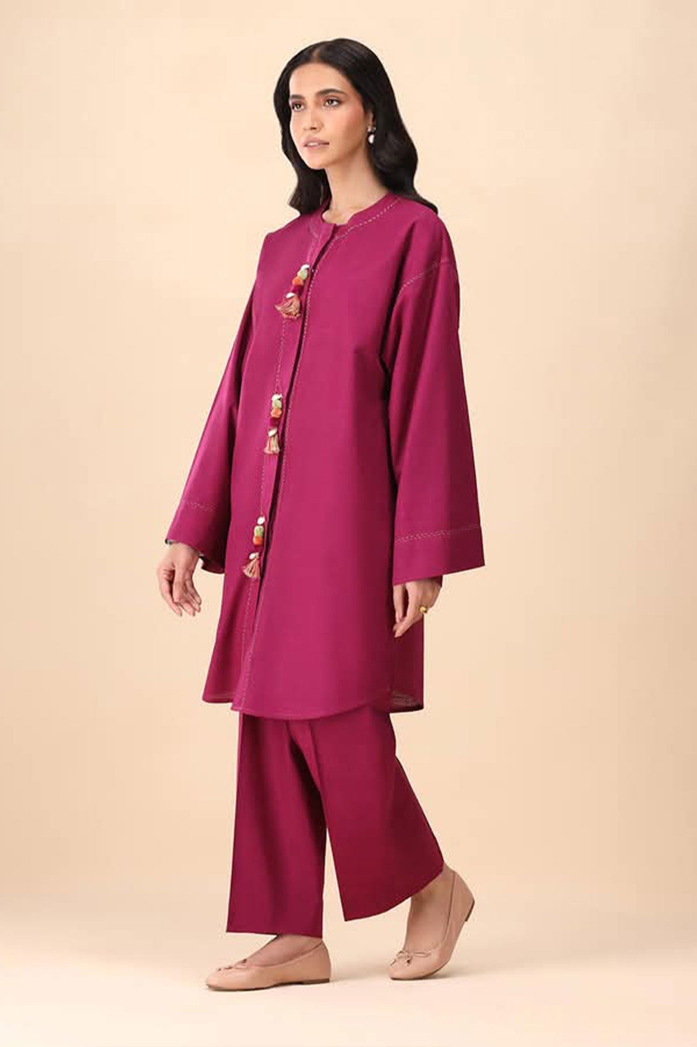 Embrace timeless elegance with the Magenta Embroidered Cotton Kurta & Pant Suit from Anam Irumz Closet. This chic two-piece set is designed for the modern woman who cherishes comfort and style, making it ideal for casual outings, family gatherings, or semi-formal events. The vibrant magenta shade adds a bold yet sophisticated touch, enhanced by subtle white thread embroidery along the neckline and front placket, complemented by colorful tassels that lend a playful charm. Crafted from breathable cotton, the straight-cut kurta and matching palazzo pants offer a relaxed fit with a smooth, lightweight feel, perfect for all-day wear. This suit is a versatile addition to any wardrobe, effortlessly pairing with minimal accessories.