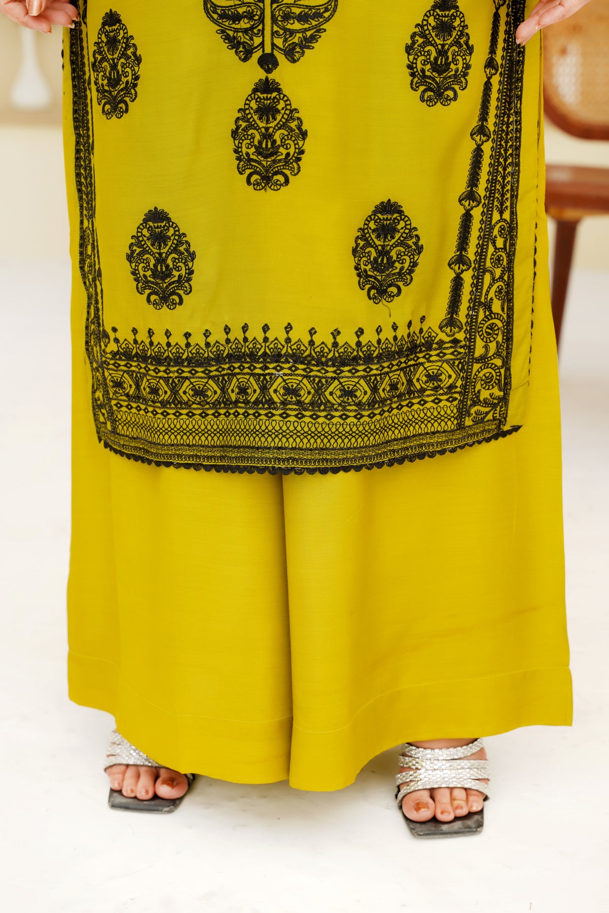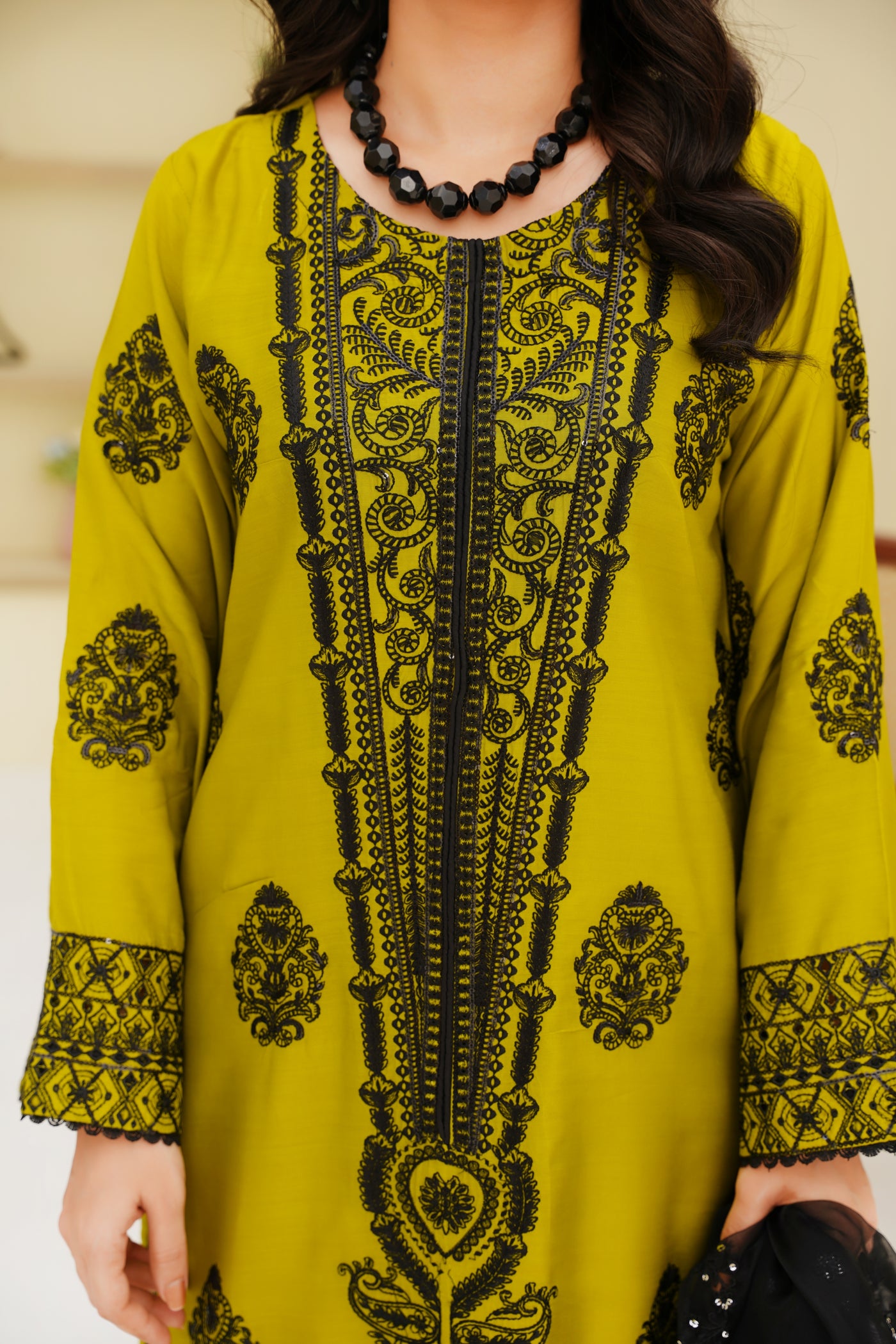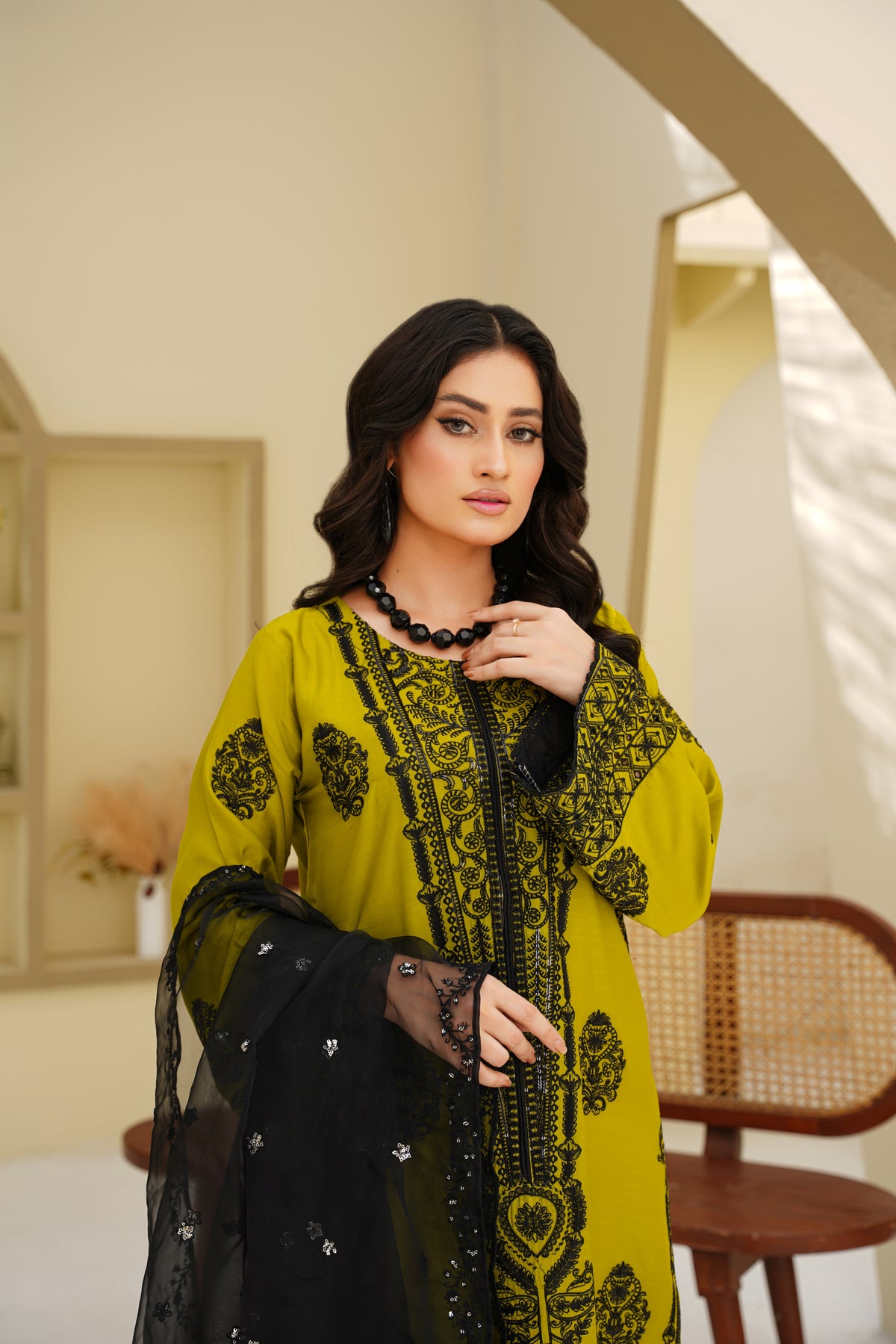 Vibrant Mustard Noir brings bold elegance to life with its radiant mustard yellow base and striking black embroidery. Crafted from breathable cambric cotton, this 3Pc Embroidered Suit features intricate threadwork on the neckline, sleeves, and hem — creating a powerful festive aesthetic. Paired with a beautifully detailed black organza dupatta and matching trousers, it’s a perfect pick for festive occasions, brunches, or evening gatherings. Sophisticated, eye-catching, and graceful — Vibrant Mustard Noir is a statement outfit for the modern woman.